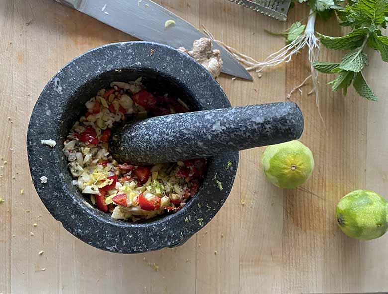 Today’s recipes may seem random, and I thought they were at first, too. But, like everything, they are fully interconnected. In this case, it all started with one of my life’s rocks, my friend Danielle, and a simple conversation about what she was making for dinner. Within an hour, my head unraveled a recipe I had created for Ger-Nis Culinary Center in Brooklyn years ago. The Culinary Center was one of my most meaningful projects. It not only served the people immediately around me but also a community of people far and wide throughout Brooklyn and the New York City metro area. One of my most popular classes was Fresh Thai, in which we made hand-pounded Thai-style sauces and dishes. I was taken by the memories of those classes and the extraordinary ordinary people who happily gathered to learn about food and cooking in a setting built for me by my brothers, skills they learned from our father, which made the space and the energy even more meaningful. Making this dish at the same time as climbing out of my selfish hole, I remembered how good I am at making meaning. I was also able to pound out a lot of grief in the process, which was a perk.