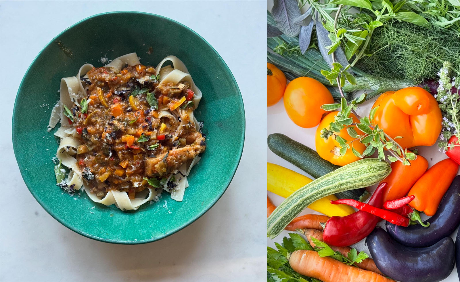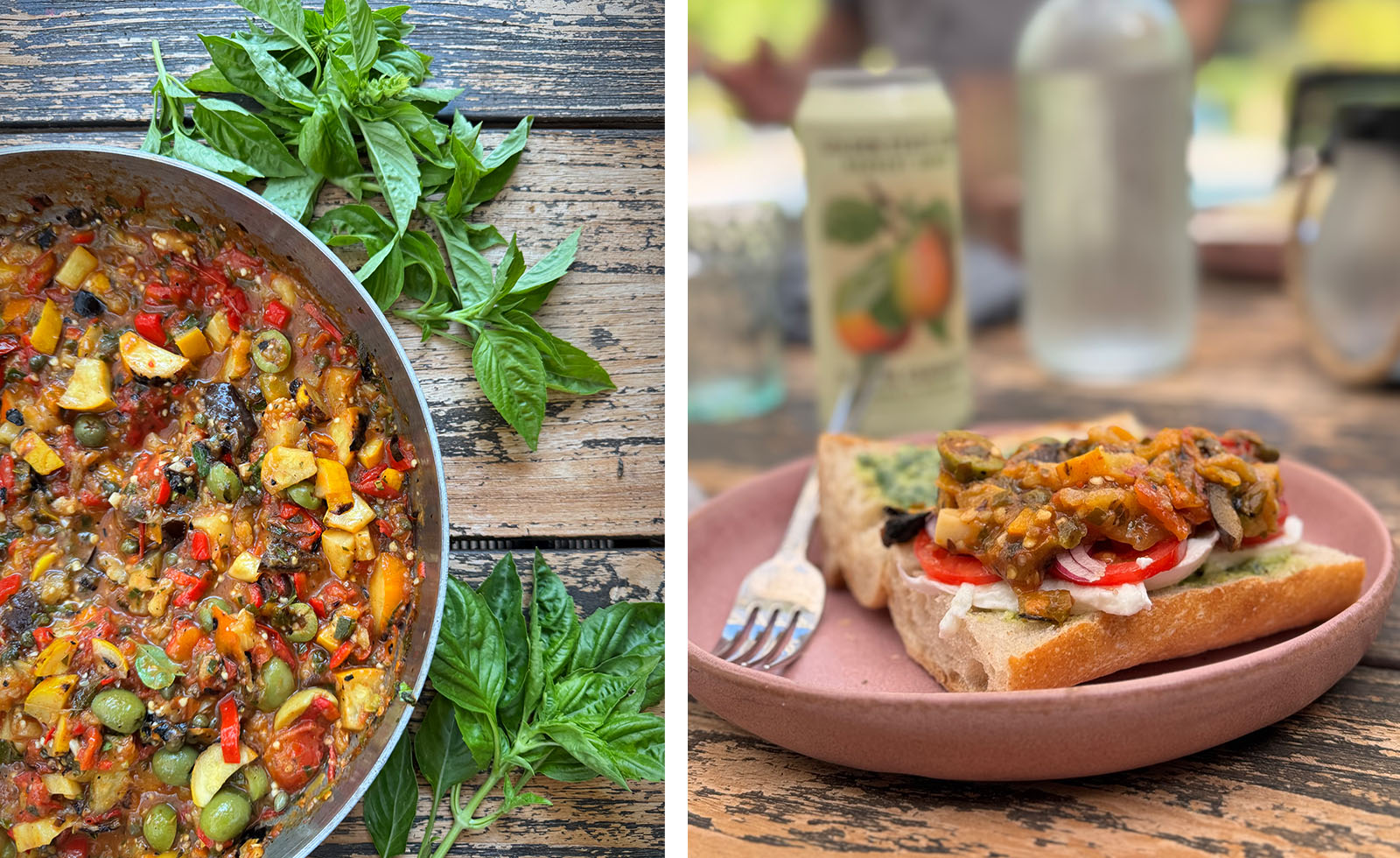 Caponata is a classic Sicilian sauce or relish — a bright, sweet-savory tangle of late-summer vegetables, herbs, olives, and capers, cooked down until everything is soft and deeply flavored. Traditionally, it leans on sugar and vinegar for its sweet-and-sour edge; I use lemon instead and let ultra-sweet tomatoes and fire-roasted eggplant bring the sweetness naturally. As is my way, I make it a little differently — overloading it with herbs, not just the soft green ones of summer but also the woody-stemmed kinds Sicilians love. That mix gives the dish a deeper, earthier character and, to me, a distinctly fall essence. It’s grounded yet vibrant, fresh but with lingering, smoky depth. This isn’t a recipe that demands measuring; it’s meant to be made with whatever the garden gives, so long as you keep the basics. Perfect for the in-between season, when eggplants, peppers, tomatoes, and zucchini tumble into our hands at summer’s end.