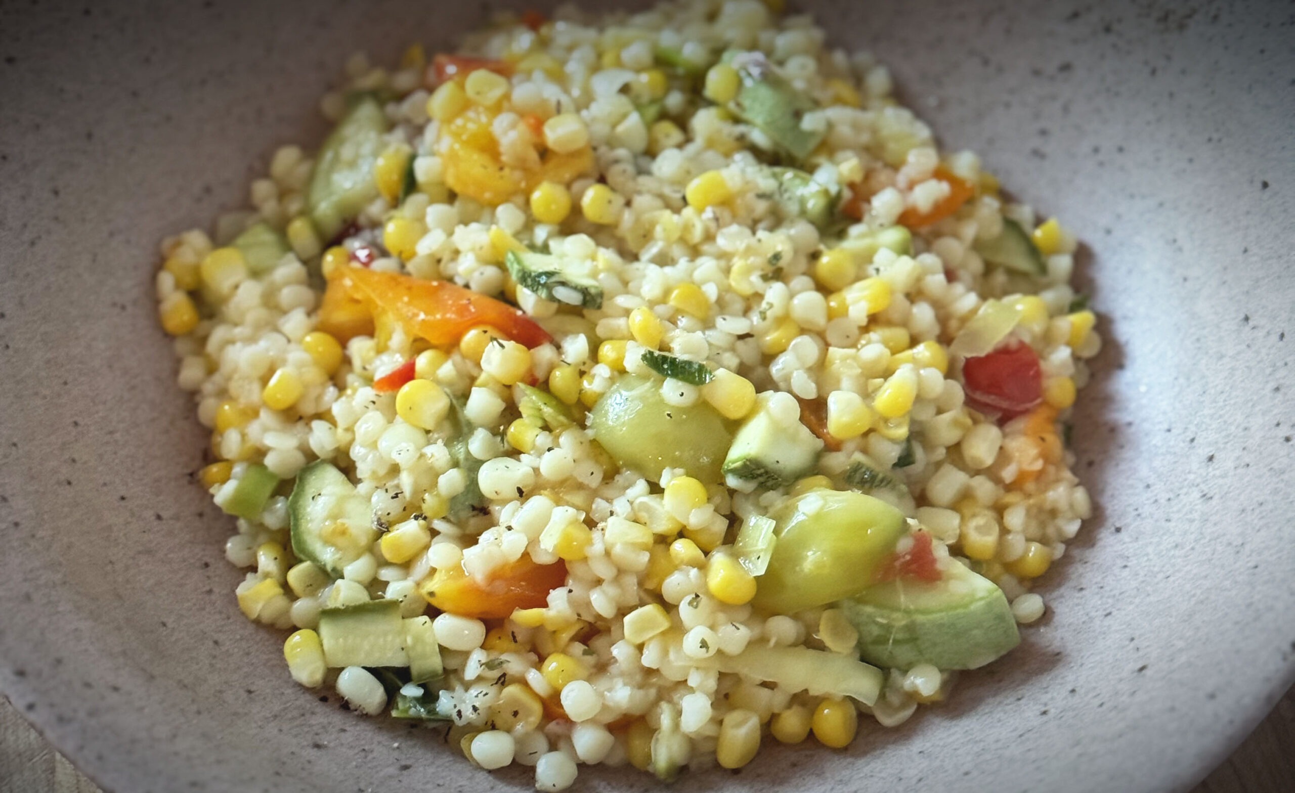 These four recipes,     Fire Roasted Caponata, Millet, Corn & Basil Salad, Zucchini & Eggplant Bolognese and Fresh Fig, Rosemary Butter Cookies have grown out of my current cycles of growth and creativity, they are as the Buddhists would say in the moment.