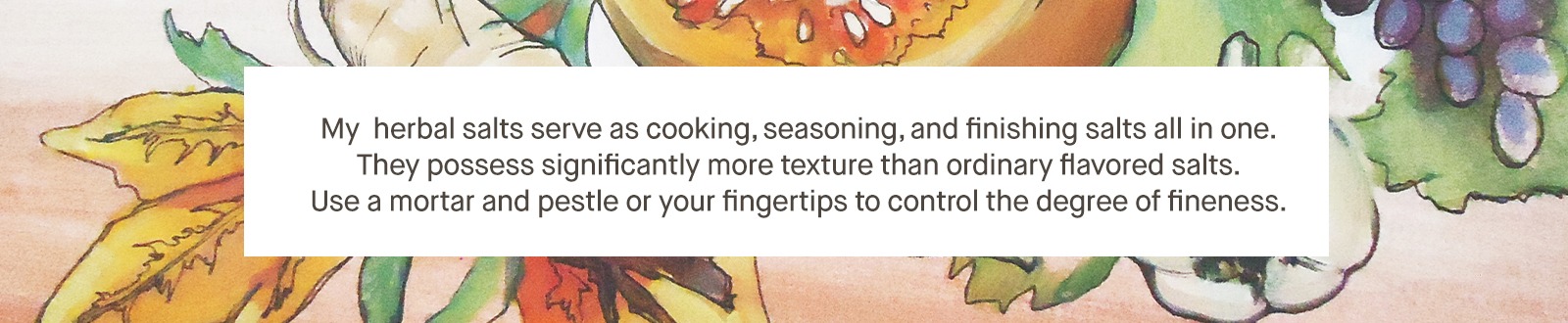 My herbal salts encapsulate a particular moment within each season. They carry more than just the flavors of the season, they capture the complexities and flavors of change and create a unique imprint of each ingredient, which melds into a one-of-a-kind essence that will never again exist in the same form.